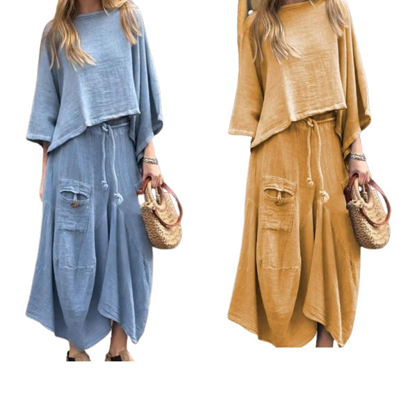 Costume 2 pièces haut à col rond et jupe ample pour femme