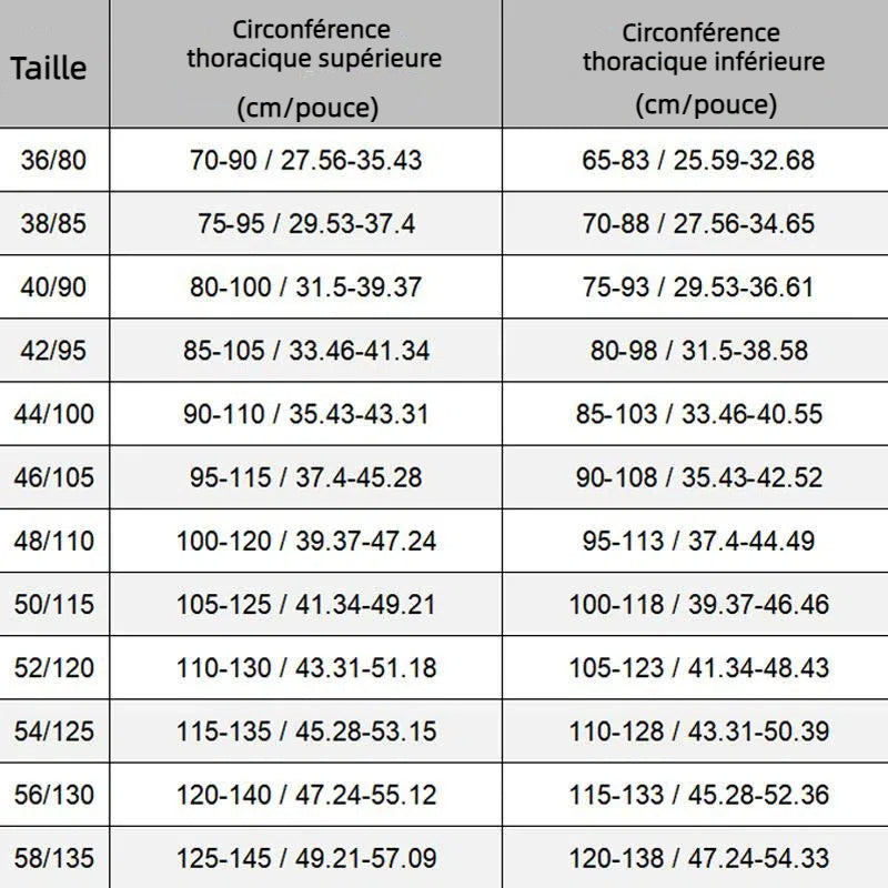 Taille : 36/80, 38/85, 40/90, 42/95, 44/100, 46/105, 48/110, 50/115, 52/120, 54/125, 56/130, 58/135