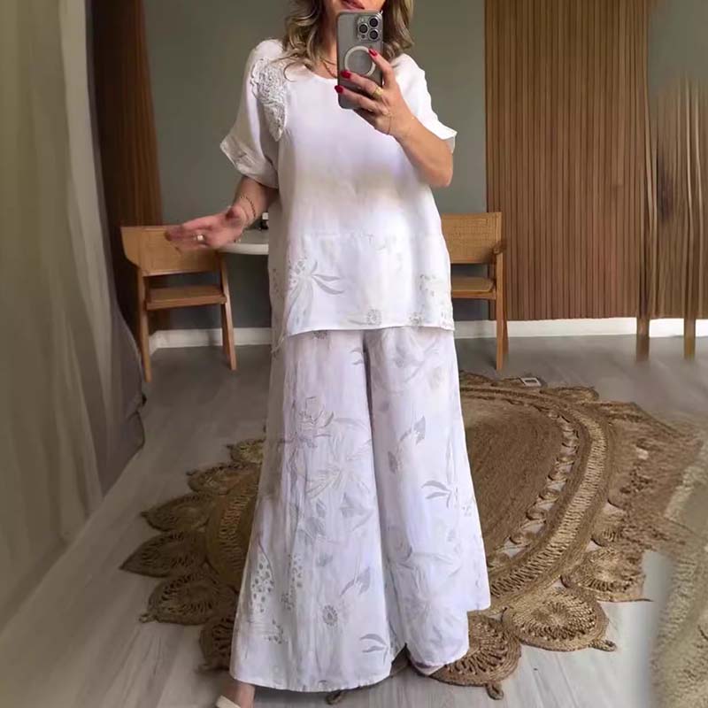 Ensemble 2 pièces imprimé décontracté pour femmes: ensemble haut à manches courtes et pantalon à jambes larges à col rond